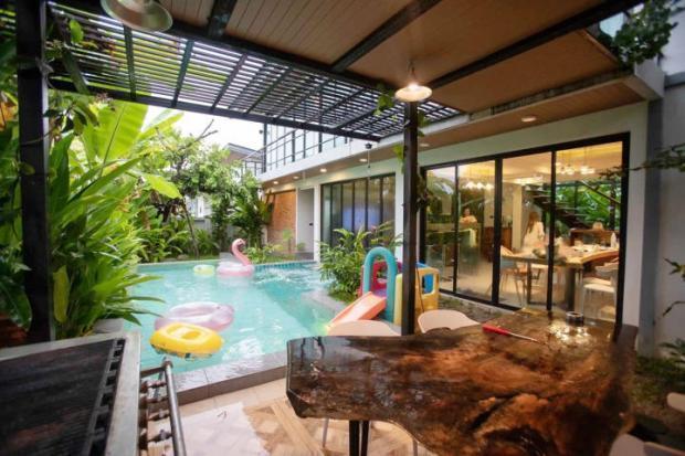 คุณสมบัติ : ที่จอดรถ , สวนหย่อม , เฟอร์นิเจอร์และอุปกรณ์ภายในครบครัน , สระว่ายน้ำส่วนตัว