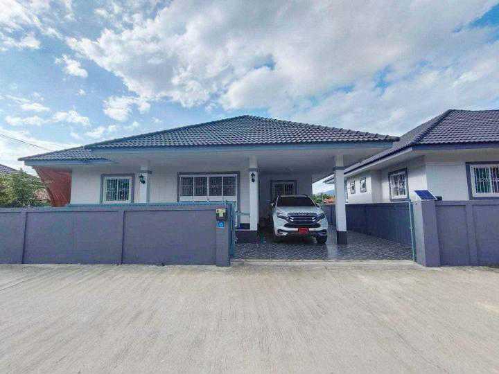 House spec : 3 Bedrooms, 2 bathrooms, 35 Sq.w. convenient travel not far from Sansai Hospital, Maejo Market, Tonkla School, Meechok Plaza. 3 卧室,2 浴室。面积 35 平方哇。 Furniture -Air conditioner 3 -Hot shower 2 -Bed 2 -Wardrobe 2 -Loungeset 1 -Dining table 1 -Television 1 -Refrigerator 1 -Microwave 1 -Washing machine 1